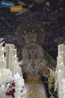Mostramos imágenes de la salida procesional extraordinaria de la Virgen de la Encarnación de la Hdad. de San Benito, a su paso por las calles Puerta de Carmona, y Luis Montoto, de regreso a su sede canónica, tras celebras Misa Pontifical en la Catedral de Santa María de la Sede, por el XXV Aniversario de su Coronación Canónica. La Hermandad del Santísimo Sacramento, Pontificia y Real Archicofradía de Nazarenos de la Sagrada Presentación de Jesús al Pueblo, Santísimo Cristo de la Sangre, Nuestra Señora de la Encarnación Coronada y San Benito Abad.; es ésta una corporación fundada en 1554, aunque desapareció en el siglo XIX, reorganizándose en 1921, con sede canónica en la iglesia de San Benito abad, siendo sus imágenes titulares Nuestro Padre Jesús en su Presentación al Pueblo, obra de Antonio Castillo Lastrucci en 1928; el Santísimo Cristo de la Sangre, tallado por Francisco Buiza Fernández en 1966, Nuestra Señora de la Encarnación, talla anónima del primer tercio del siglo XVII; María Santísima de la Encarnación Gloriosa, talla anónima de mediados del siglo XVI, atribuible a la órbita de Juan Bautista Vázquez "El Viejo"; San Juan Evangelista, talla de Antonio Castillo Lastrucci de 1959; y un Niño Jesús, de Juan Antonio Blanco Ramos, en 2001.